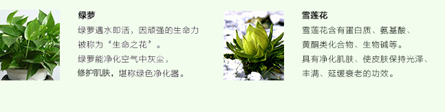 • 功       效: 采用独特的超服帖植物“隐形”膜布,添加绿萝及多种植物提取物,将绿萝精粹凝聚成一层绿色的防护膜,为您的肌肤筑一道安心的绿色围墙,有效修护肌肤,提升肌肤抵御力,改善肌肤粗糙,减少外界环境对肌肤的伤害,重新焕发健康光彩。
