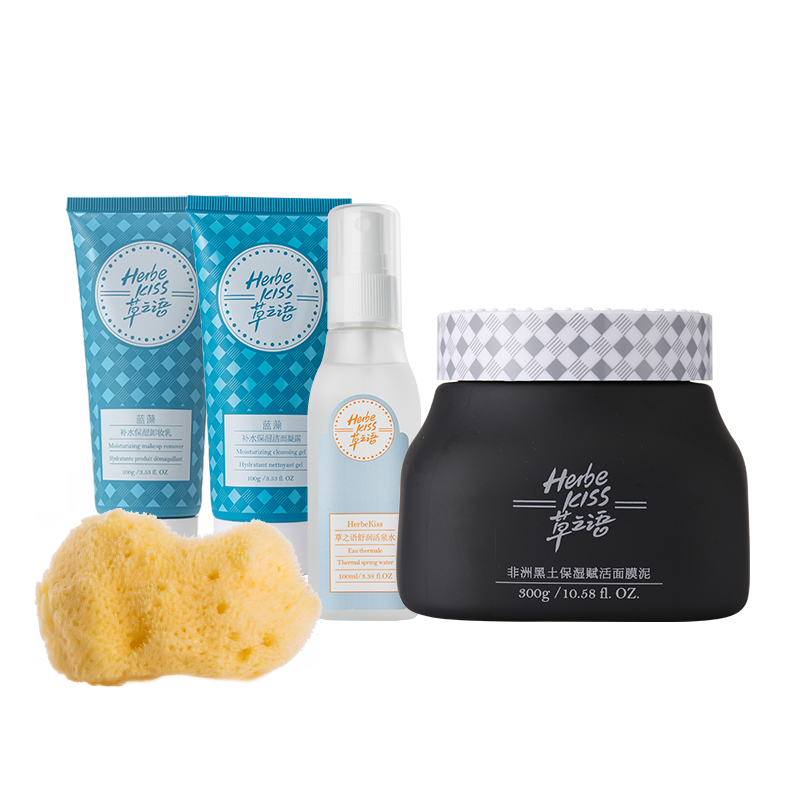 *产品明细:100g蓝藻补水保湿卸妆乳,100g蓝藻补水保湿洁面凝露,100ml舒润活泉水,300g非洲黑土保湿赋活面膜泥,天然洁肤海绵