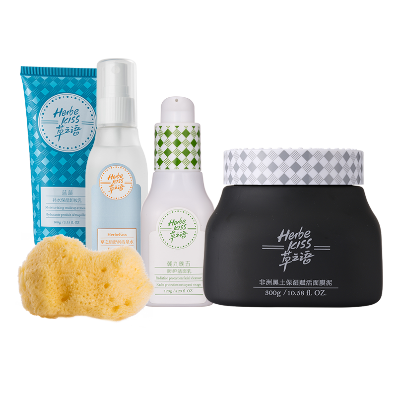 产品明细:100g蓝藻补水保湿卸妆乳,120g朝九晚五防护洁面乳,100ml舒润活泉水,300g非洲黑土保湿赋活面膜泥,天然洁肤海绵