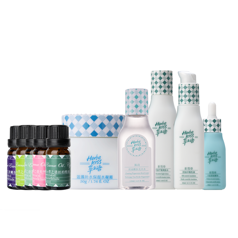 产品明细:150ml薄荷控油醒肤花卉水,积雪草控油平衡爽肤水,30ml积雪草T区控油菁华,80ml积雪草控油平衡乳液,50g蓝藻补水保湿水凝霜,10ml草之语薰衣草单方精油,10ml草之语薄荷精油,10ml草之语茶树单方精油,10ml草之语丝柏精油,10ml草之语天竺葵精油